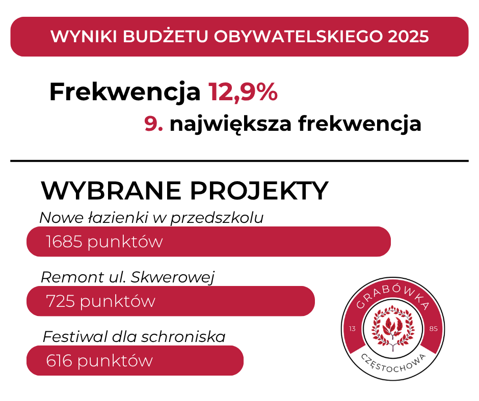 Z dumą informujemy, że Grabówka zajęła 9. miejsce w Częstochowie pod względem frekwencji – aż 12,96% mieszkańców oddało głos!